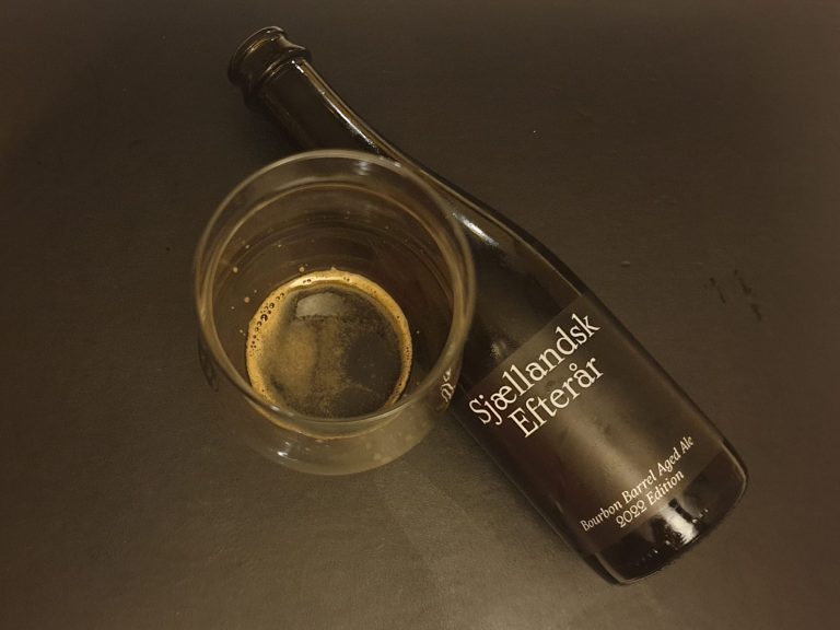 Sjællandsk Efterår from To Øl is a 12% bourbon barrel-aged ale showing roast, dark chocolate, oak, vanilla, black cherry acidity, tannin and light smoke, developing gradually as temperature rises in the glass.